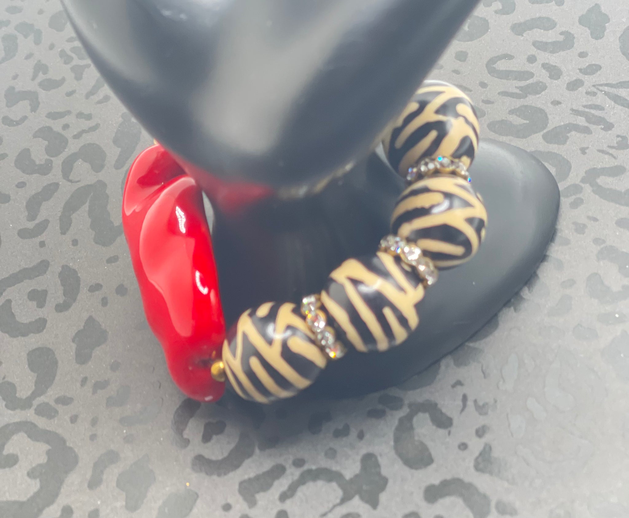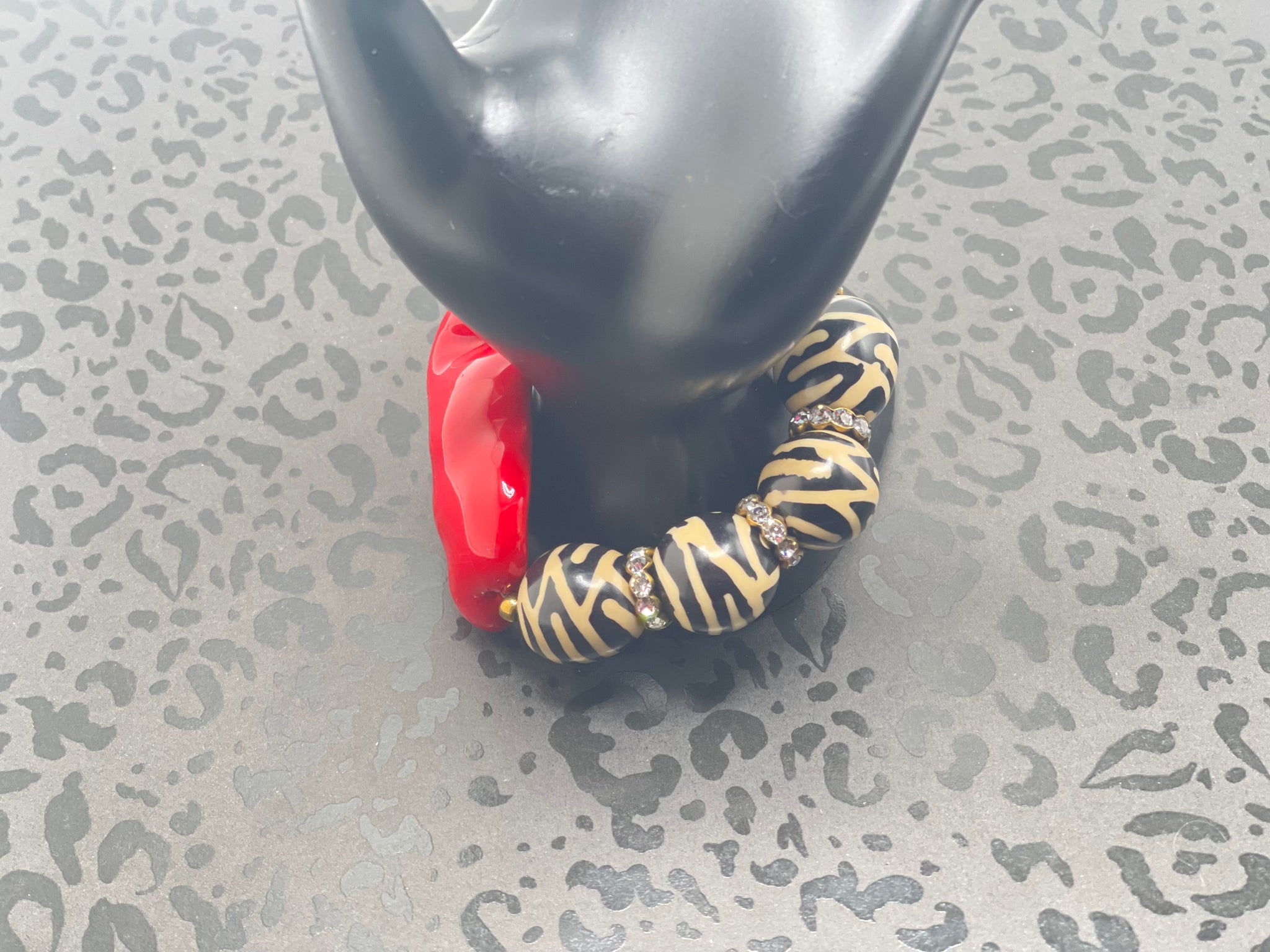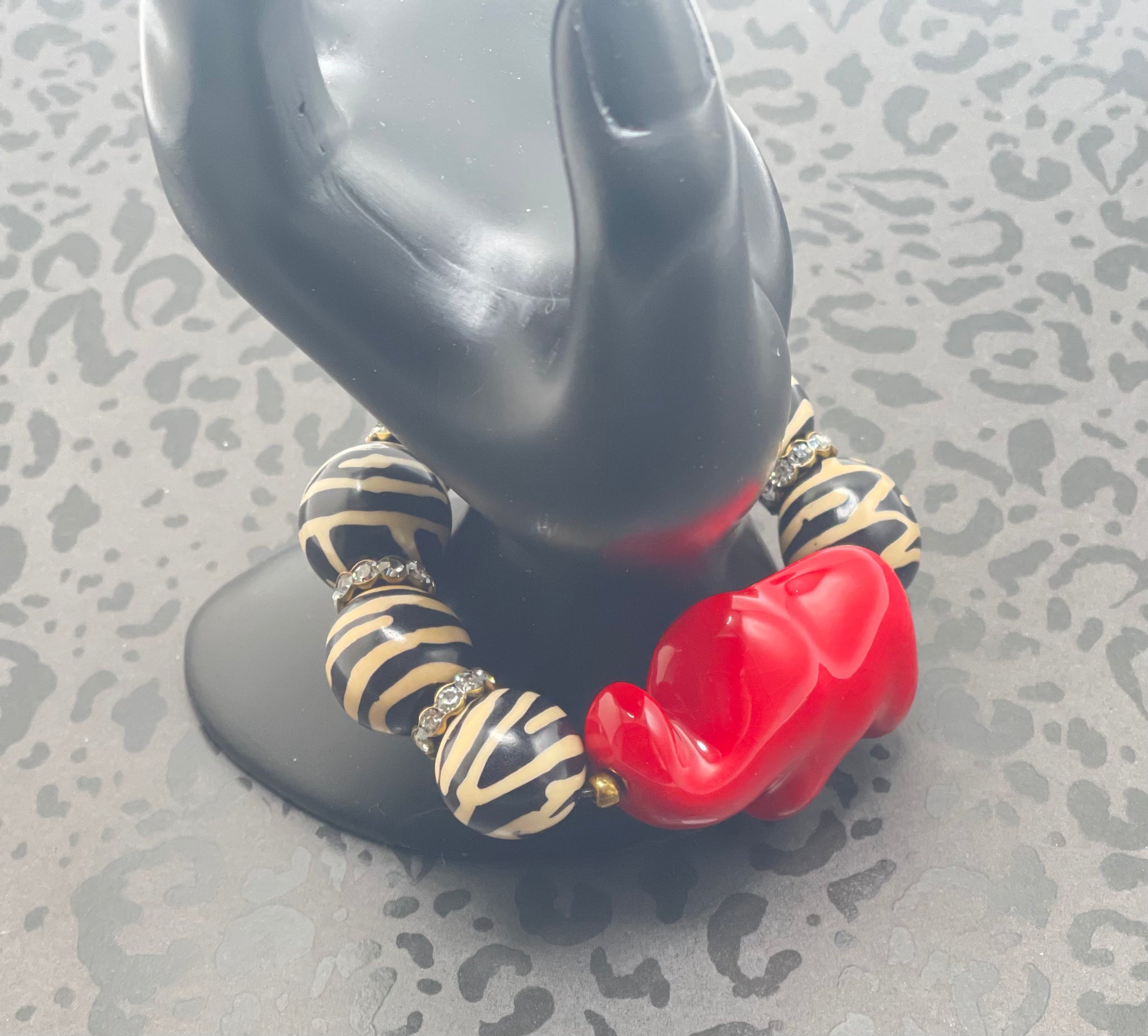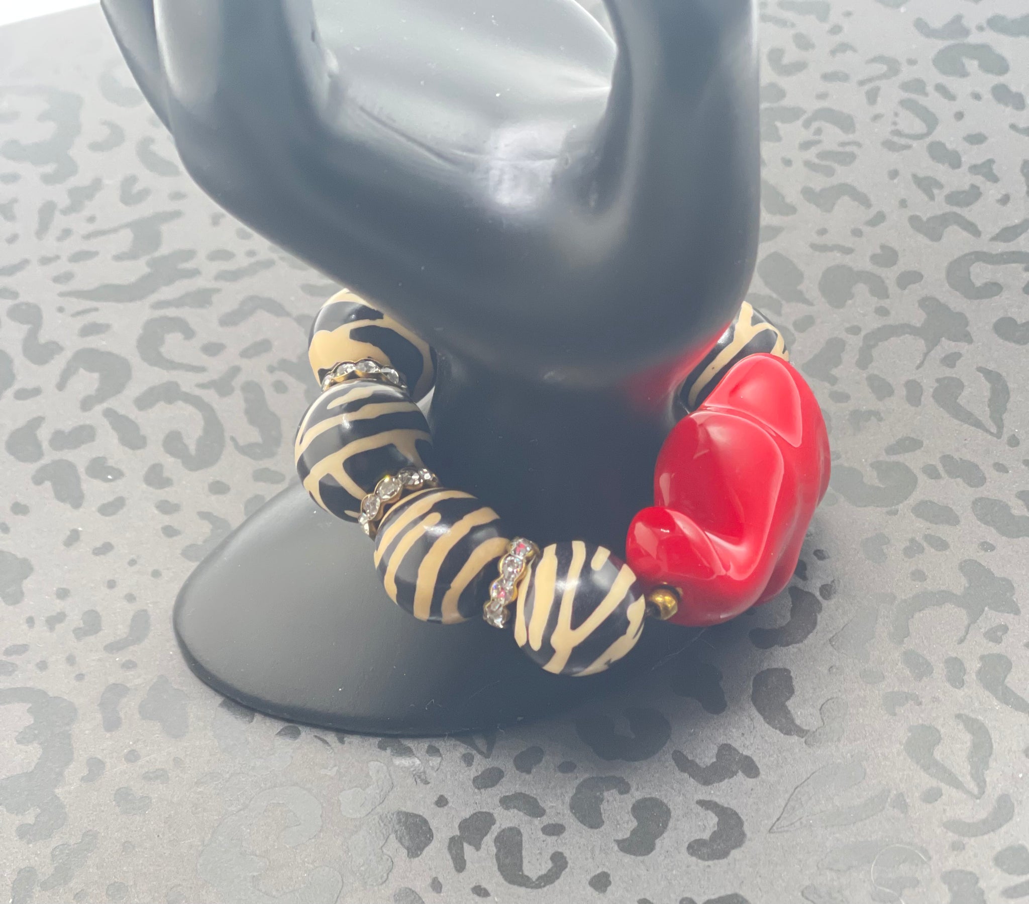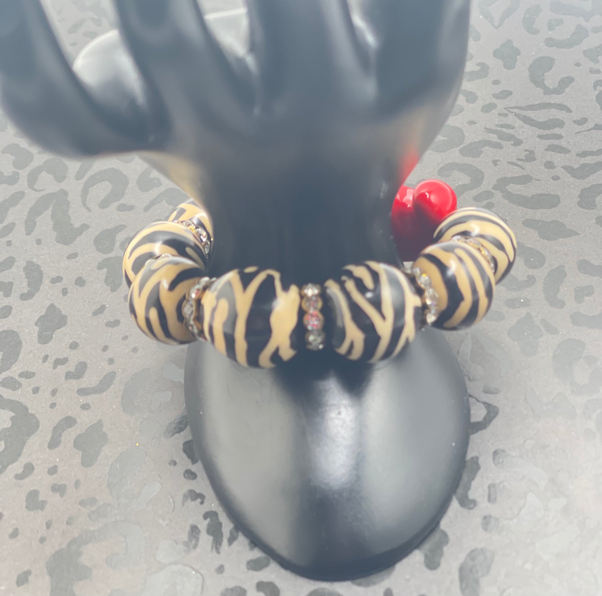 This stretch bracelet features a focal point of a red elephant design. The beads included are Bombona, which are similar to organic ivory from Tagua beans, and have an animal print pattern.