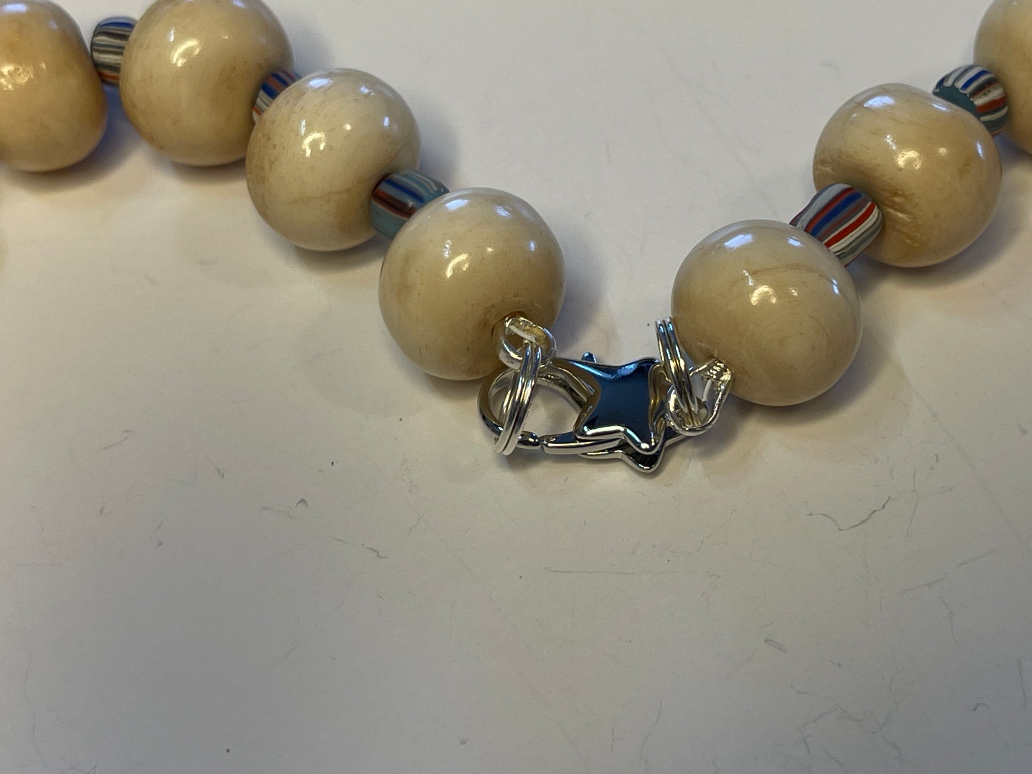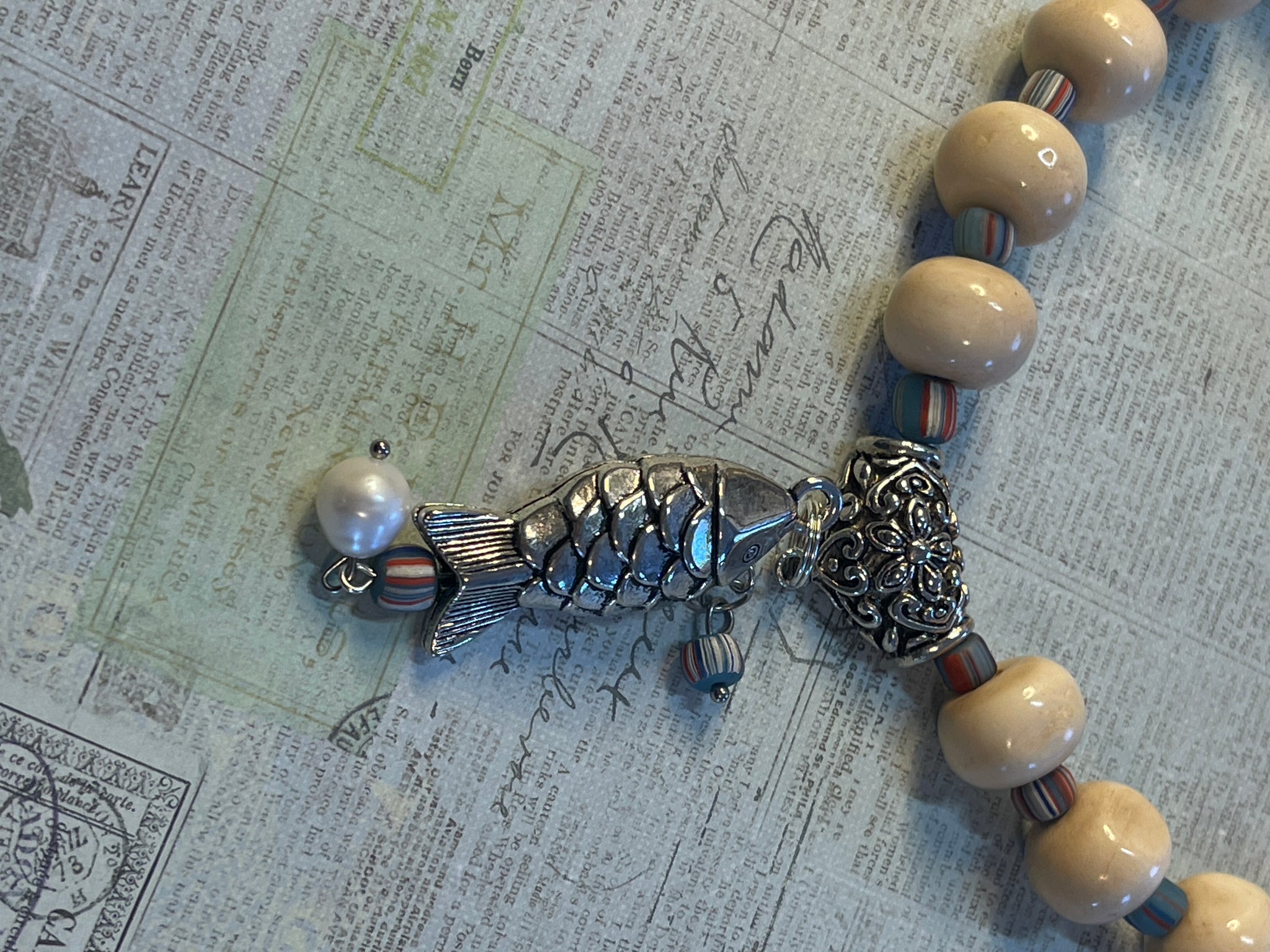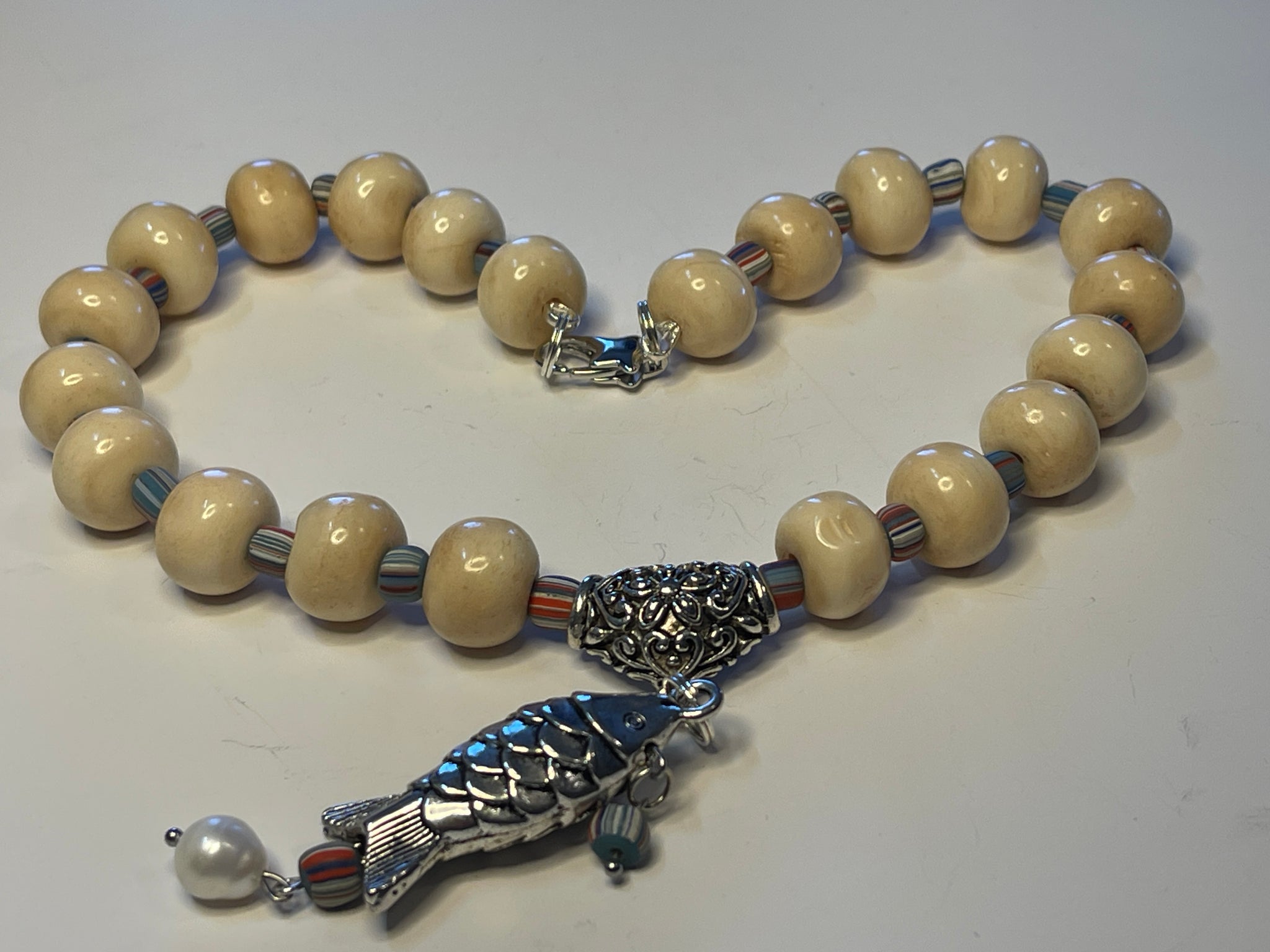 This necklace features large rondelle bone beads paired with silver accents, highlighted by chevron glass spacers. It is adorned with a fish pendant complemented by a charming freshwater pearl, creating a unique and elegant accessory.